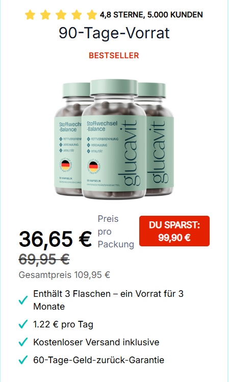 Als Antwort darauf erscheint Glucavit als eine natürliche und innovative Lösung: ein Nahrungsergänzungsmittel, das speziell entwickelt wurde, um die Ursachen der Gewichtskontrolle zu bekämpfen. Sein Ziel? Von innen zu wirken, um Ihren Stoffwechsel zu unterstützen, Heißhunger zu kontrollieren und das allgemeine Wohlbefinden zu fördern – dank einer Kombination sorgfältig ausgewählter natürlicher Inhaltsstoffe.