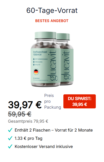Dies ist das Fundament des Vertrauens in dieses Angebot. Der Hersteller ist von der Wirksamkeit von Glucavit so überzeugt, dass er eine 60-tägige Geld-zurück-Garantie bietet.